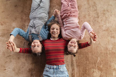 Top view of happy three sisters kids lying on floor and looking at camera.