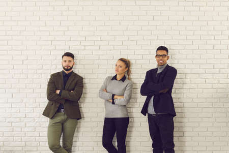 Group portrait of confident young diverse company employees or managers. Team of successful multiethnic business people looking at camera, standing arms folded near white brick wall of loft office