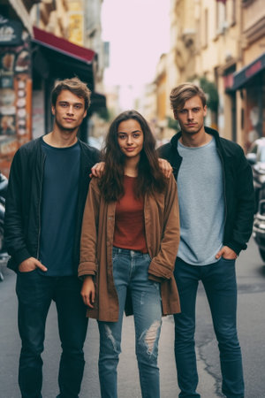 Close up of three happy young people smiling and looking relaxed in the street. Group of millennials staring at camera hopeful smiling together.