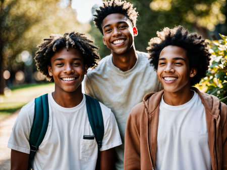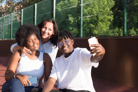 Generative AI : Multiracial friends taking selfie at college campus Happy friendship concept with young students having fun together in the park