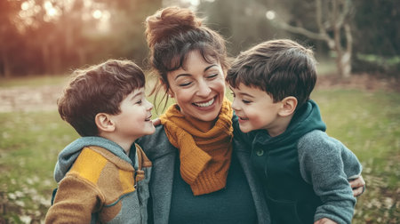 A loving mother shares a joyful moment with her twin sons in a sunny outdoor setting, surrounded by greenery