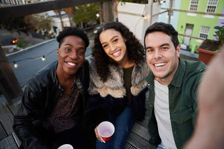 Group of multi-cultural young adults smiling while taking a selfie. At rooftop party in the city, good times.