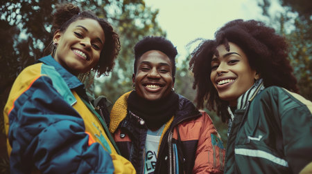 Portrait of group of black young people in retro 90s clothes and haircuts, photo of friends in nineties style, AI generated