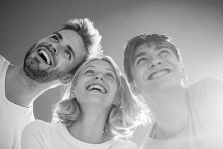 Group of happy griends. Smiling best friends at clear sky background having good time outdoor at summer time. Two boys and blonde girl spend leisure time together during summer vacation.