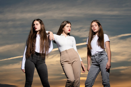 Group of girlfriends having fun outdoors. Stylish teenage girlfriends friends on vacation. Pretty girlfriends. Girls on travel. Fashionable teens. Three girlfriends in hippie style. Gen Z friends.
