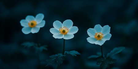 Close-up Shot, Wild Anemones Blooming at Night With White Petals Against a Dark Blurred Background