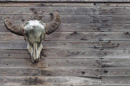buffalo head bone hanging on the old wooden wall. buffalo head bone hangs on the wall is a decoration symbol of cowboy country house in american farm and house.