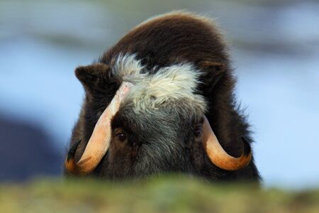 Wildlife from the Norway. Musk Ox, Ovibos moschatus, with mountain Snoheta in the background, big animal in the nature habitat.