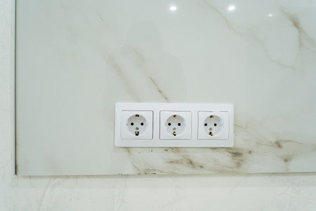 On a beautifully polished marble wall, there are three distinct white electrical outlets that have been expertly installed, ensuring convenient access to power for various devices and appliances