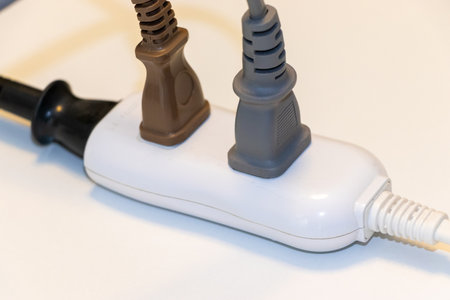 electrical plug and socket overloaded on white background, (selective focus)