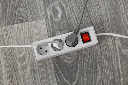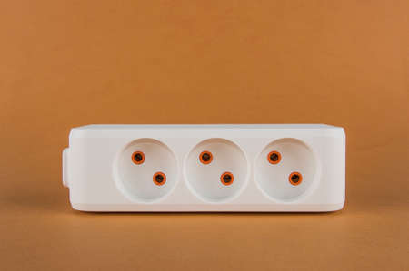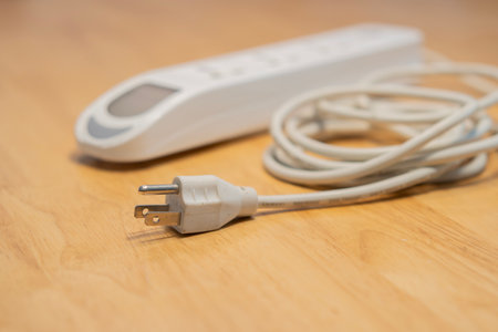 Electrical plug in outlet socket at home, Electrical plug in outlet socket at home, Energy efficiency concept, Power strip with extension cord on beige background, top view.