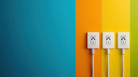 This stock photo features three electrical outlets with white cords against a vibrant backdrop of blue, orange, and green stripes, highlighting modern design and energy accessibility.