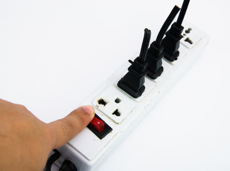 hand switch on/off socket plug electric power bar white color isolate. save energy and reduce energy efficiency concept