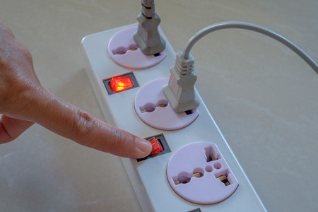 Close up Hand holding Electric plug put on multiple socket. Electrical equipment, electrical wires and power strips in the house. Earth Hour saving electrical energy.