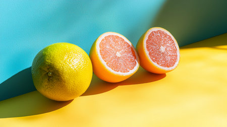 Whole and halved grapefruits arranged on a brightly colored background with playful lighting, creating a fresh and vibrant look in a modern abstract setting.