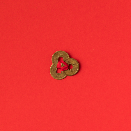 top view of decorative chinese lucky coins isolated on red