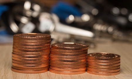 A stack of coins with the top one being a quarter. The coins are stacked on top of each other