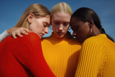 Three individuals share a captivating moment under soft lighting, showing a blend of natural beauty and elegance with an intense gaze. Perfect for creative projects. Generated A.I.