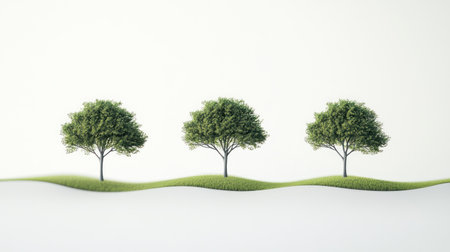 Three miniature trees with lush green foliage are neatly arranged in a row, each perched on a gentle, undulating green strip, creating a serene and balanced visual.