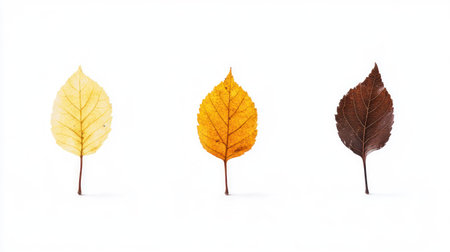 A trio of autumn leaves, each displaying a distinct stage of fall coloration, from bright yellow to deep brown, highlighting nature's seasonal change.