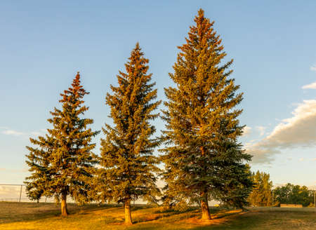 Three tall evergreen trees stand in silhouette against a backdrop of a partly cloudy sky, with soft, pastel-colored clouds dominating the scene.