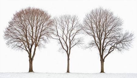 Three deciduous trees stand in a line on a snowy surface, with the leftmost tree retaining some brown foliage, contrasting with the bare branches of the others.