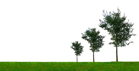 Vibrant green trees with thick leaves clustered together on a grassy patch, creating a serene natural scene against a clean, bright white backdrop.