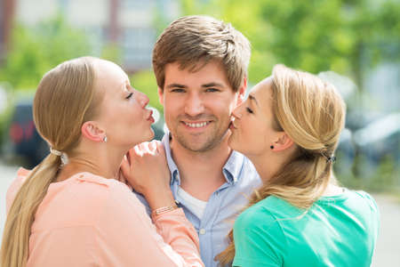 Two brunette women kissing brunette man on the cheeks. Concept of love, affection, romantic relationships, love triangle, intimate moments, emotional intimacy.