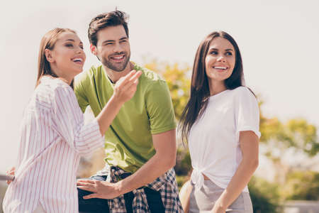 Portrait of company of three good friends travellng together have excursion hand indicate far away outdoors