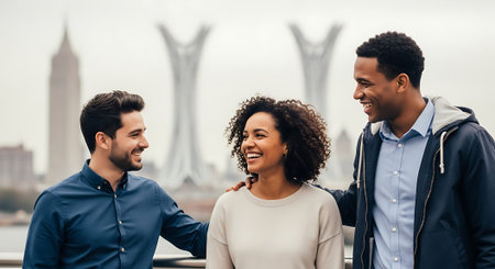 Three happy friends standing together outdoors in a city, smiling and enjoying each other's company with modern buildings in the background.