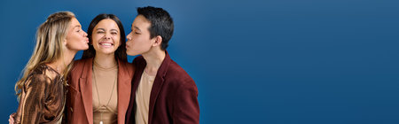 cute diverse teenage boy and girl kissing their jolly friend in cheek, friendship day, banner