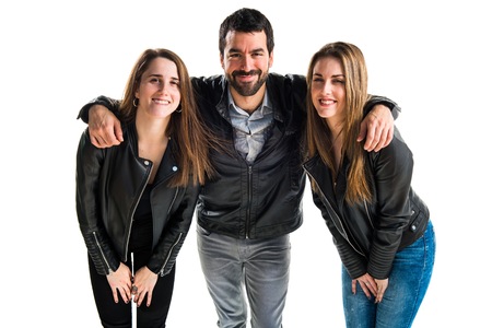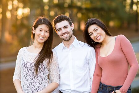 Group of three multiracial young friends having fun and smiling looking at camera. Front view of happy multiethnic people with cheerful attitude. Life style concept.