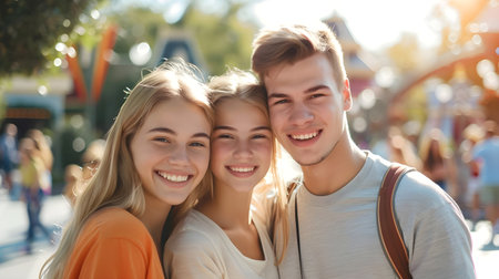 Three friends are happily posing for a selfie outdoors, surrounded by an urban backdrop, radiating joy and friendship in a lively atmosphere
