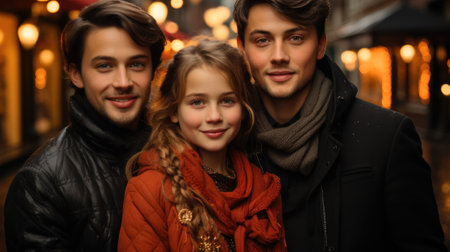 Three happy friends walk arm-in-arm down a city street, laughing and enjoying each other's company. Dressed in casual jackets, they represent friendship and urban lifestyle during the autumn season.