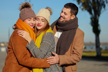 Man and two beautiful women in autumn clothes hugging at waterfront. Polyamory concept