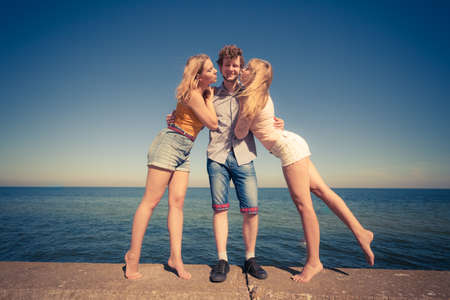 Friendship happiness love concept. Group of friends boy two girls having fun outdoor, women kissing man