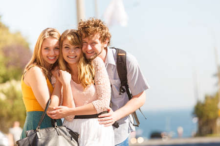 Friend zone concept. Happy together. Cheerful friends. People outdoors. Happy woman and two men. Friendship love. Friendship relations. Member friendship wishes to enter into romantic relationship