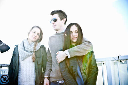 Love triangle. friendship and love relations. spend free time together. outdoor lifestyle and summer activity. handsome man and sexy girl friends relax outdoor. fashion and beauty