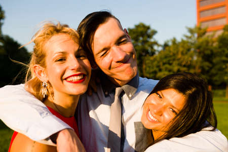 Three happy smiling young people friends outdoor. Attractive women and handsome man portrait. Summer vacation.