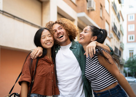 Three cheerful diverse friends are walking down the street, enjoying each other's company and smiling