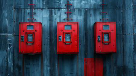 Industrial electrical boxes mounted on exterior wall with red handles