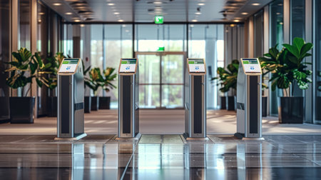 subway system with a photograph of turnstiles at the entrance of an empty station, providing blank space for design or advertising purposes, with a focus on the distinct character of each turnstile