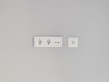 Three electrical outlets are aligned on a soft gray wall, featuring two round sockets and one rectangular network outlet, creating a clean and modern appearance in the space