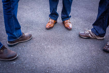 Legs of job candidates waiting in queue for career opportunity, being nervous and stressed about recruitment meeting. Agitated people sitting in office lobby to meet with HR team. Close up.