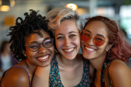 Three cheerful young adults bonding and laughing together in a bustling indoor setting
