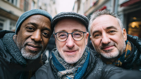 Three older men in outdoor urban selfie, wearing hats and scarves in cool weather.