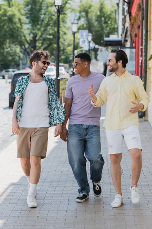 Overjoyed multiethnic friends walking on Andrews descent in Kyiv