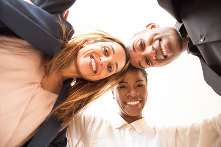 Portrait of smiling colleagues embracing and looking at camera. Low angle view of three happy multiethnic businesspeople. Business team concept
