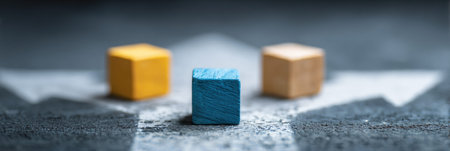 Colored blocks sit on a gray surface, illustrating the concept of decision making in a minimal startup environment during early business planning.