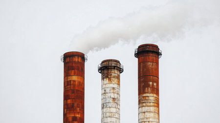 Three rusty smokestacks release white smoke into the overcast sky, illustrating the impact of industrial pollution on urban environments.